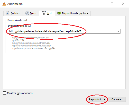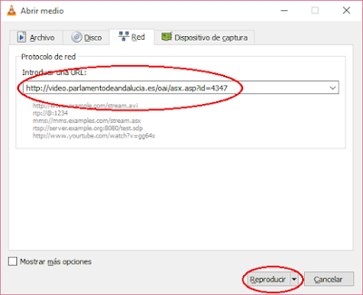 7º En la ventana que se nos abre introducimos esta dirección: http://video.parlamentodeandalucia.es/oai/asx.asp?id=4347 y pulsamos "Reproducir"