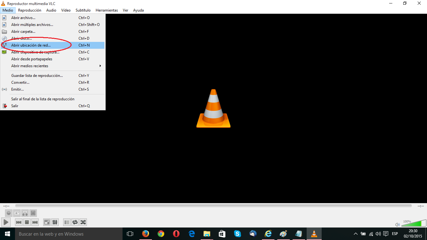 6º Una vez iniciado el programa VLC seleccionamos "Medio" y "abrir ubicación de red":
