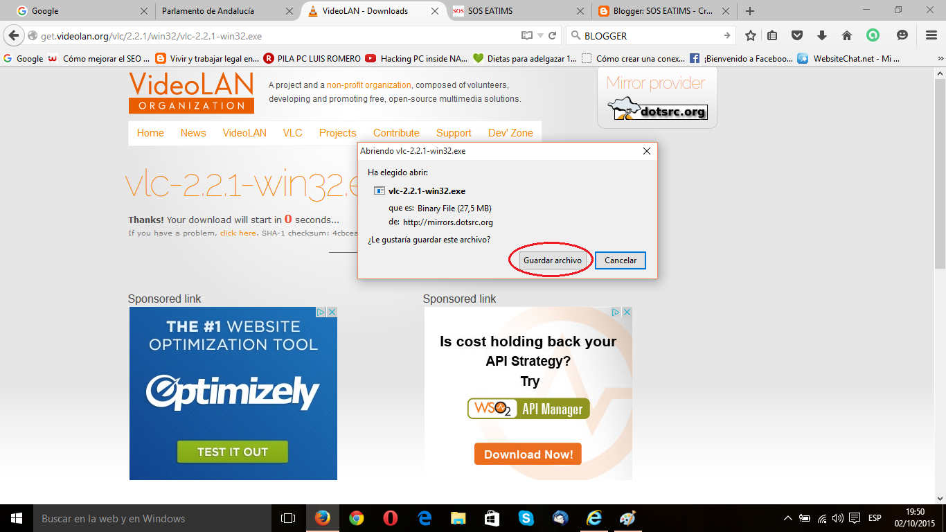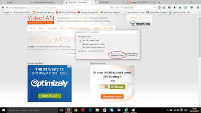 2º Nos descargamos VLC pulsando en el botón naranja "Descargar VLC" y después pulsamos en "Guardar Archivo":